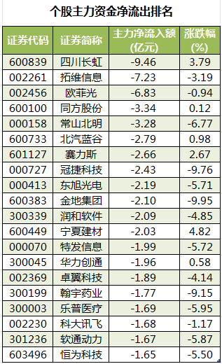 此外,3058只个股被主力资金净卖出,其中,39股被主力资金净卖出超1亿元。主力资金净流出最多的个股是四川长虹,净流出金额为9.46亿元;主力资金净流出居前的个股还有拓维信息、欧菲光、同方股份、常山北明、北汽蓝谷,净流出金额分别为7.23亿元、6.83亿元、3.34亿元、3.28亿元、2.79亿元。
