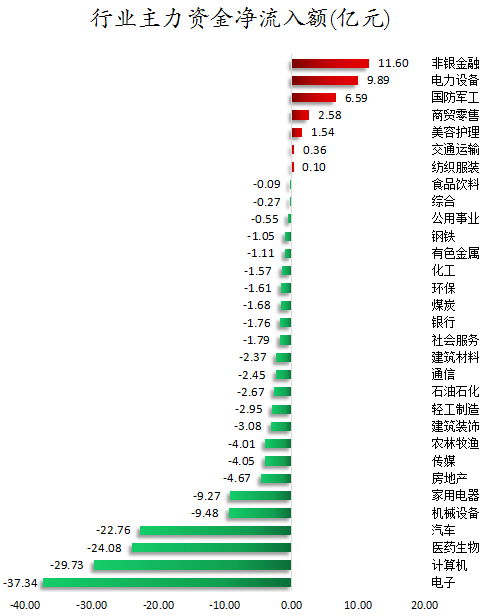 从行业板块来看,申万所属的31个一级行业,今日有7个行业板块主力资金呈现净流入,其中,非银金融行业板块主力资金净流入最多,净流入金额11.6亿元;行业板块主力资金净流入居前的还有电力设备、国防军工、商贸零售,净流入金额分别为9.89亿元、6.59亿元、2.58亿元。24个行业板块主力资金呈现净流出,其中,电子行业板块主力资金净流出最多,净流出金额为37.34亿元;行业板块主力资金净流出靠前的还有计算机、医药生物、汽车、机械设备、家用电器,净流出金额分别为29.73亿元、24.08亿元、22.76亿元、9.48亿元、9.27亿元。