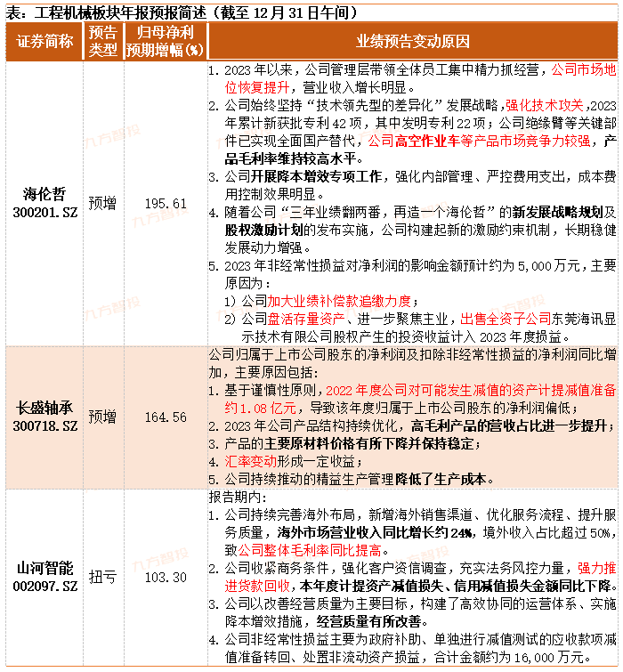 从业绩预期变动来看,工程机械板块(含器件/零部件)业绩预喜占比领先。海伦哲、柳工、杭叉集管等9家上市公司有望实现2023年度归母净利润同比正增长;其中,海伦哲、长盛轴承、山河智能的净利润同比增幅预计将超过100%。总体上,液压等中上游核心器件环节的业绩预喜力度略超下游主机厂商,行业上年度整体承压情况或好于前期市场担忧。