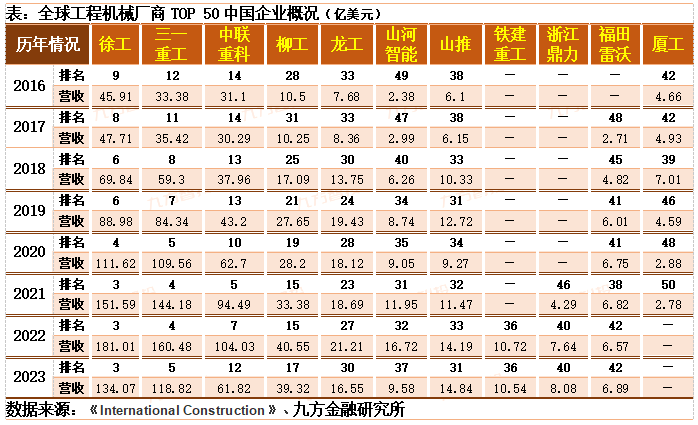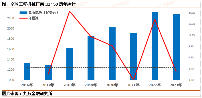 立足全球视角,在2023年的全球行业背景下,中国工程机械厂商面对的情况和自身的表现需要谨慎看待。根据全球工程机械厂商TOP50名单显示,2016年以来的全球龙头厂商营收总额总体成长趋势明确,但是2023年的营收数据出现边际回落;面对宏观经济压力持续释放,全球工程机械行业总体同样呈现出承压表现。因此,海外市场对于工程机械设备的需求前景或需重新看待。