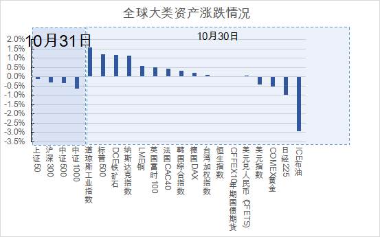 股指方面,10月31日A股成交小幅缩量至9193亿元,但K线是一个带有较长下影线的十字星型,指数并没有表现出较强的向下动能。