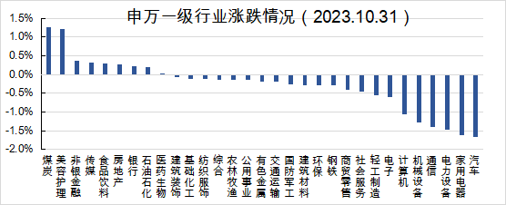 10月31日A股多数行业下跌,煤炭、美容护理等行业涨幅超1%,但新能源板块及家电、通信等行业均出现下跌。其中,美容护理行业目前仍在发出底背离信号,但底背离现象被证实的概率均有所提升。而基础化工、有色金属、食品饮料、轻工制造、建筑材料、电力设备、非银金融、纺织服饰、交通运输等多个行业的底背离现象已被证实,后续有望继续反弹。