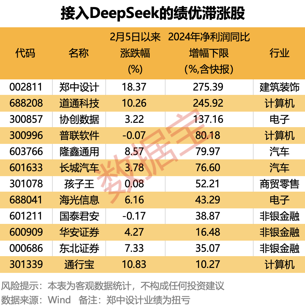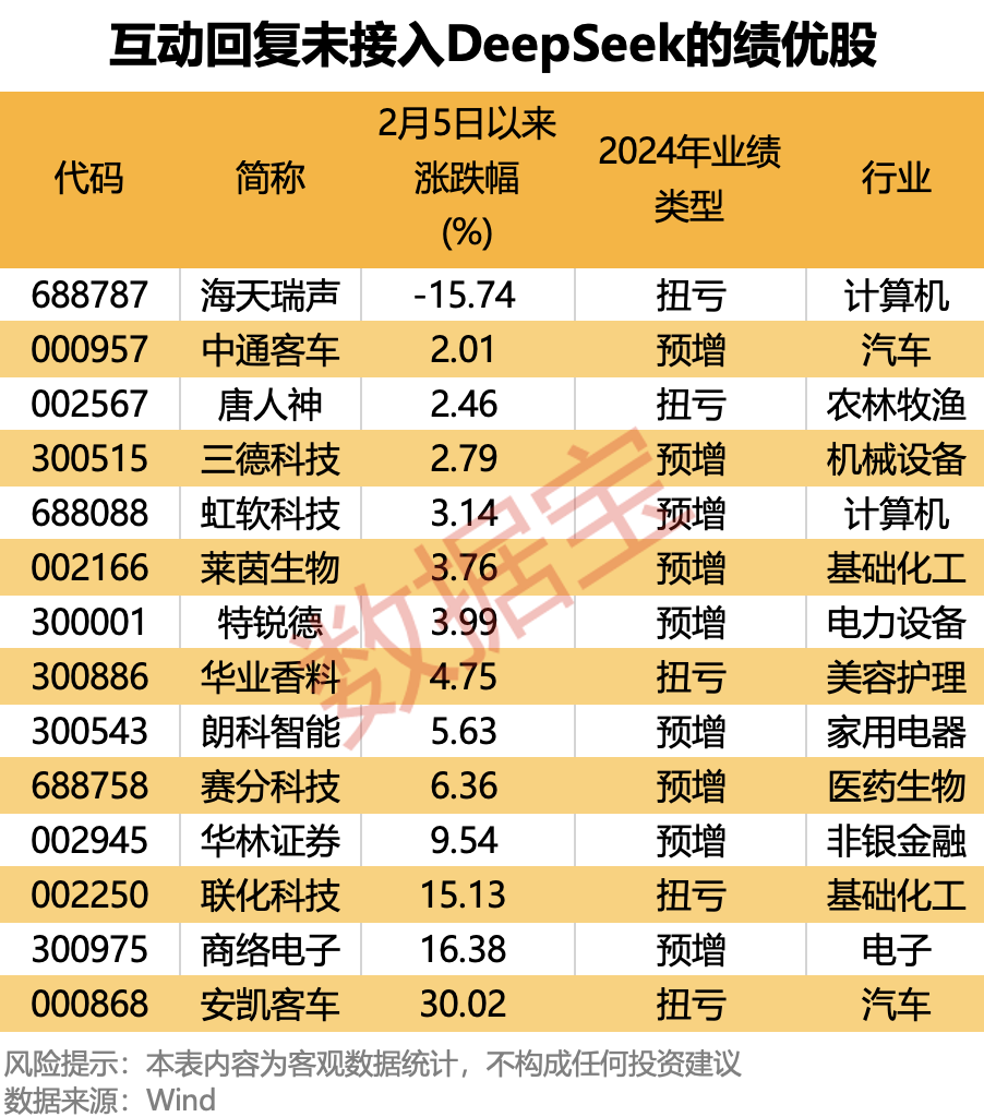 当然,上述未接入DeepSeek的公司中,不少绩优股值得关注。据证券时报·数据宝统计,以上公司中,2024年业绩预喜(扭亏、预增)的公司有14家,除安凯客车外,中通客车、唐人神、三德科技等均在列。