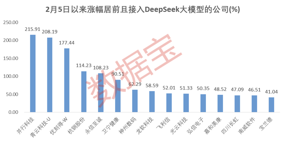 从市场表现来看,自2月5日至2月14日,接入DeepSeek大模型的98家公司,区间平均涨幅超过25%,其中12家公司区间涨幅超过50%。