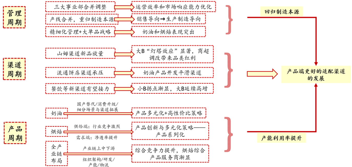 公司于2022年下半年开始实行组织架构改革,2024年逐步进入常态化运作;基于品类逻辑整合产线,使得产品端更好适配渠道的发展。奶油和冷冻烘焙,本质是供应链业务,最后竞争的落脚点在规模效应带来的优势。当前的组织架构更好的发挥公司制造规模的优势,回归制造本源,不断的提高公司的生产效率,这也是盈利能力能够改善的核心驱动之一。