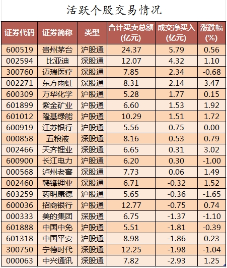 活跃个股方面,北向资金今日净买入较多的有贵州茅台、比亚迪、迈瑞医疗、东方雨虹、万华化学,净买入金额分别为5.79亿元、4.32亿元、2.34亿元、2.14亿元、1.77亿元。北向资金净卖出较多的有中兴通讯、宁德时代、中国平安、中国中免、美的集团,净卖出金额分别为2.93亿元、1.98亿元、1.86亿元、1.81亿元、1.37亿元。