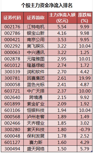 个股来看,今日有2001只个股获主力资金净流入,其中,33股获主力资金净流入超1亿元。江特电机获主力资金净流入最多,净流入金额为5.54亿元;主力资金净流入居前的个股还有银宝山新、南京公用、奥飞娱乐、中兴通讯、元隆雅图,流入金额分别为4.16亿元、3.53亿元、3.22亿元、3.22亿元、2.95亿元。