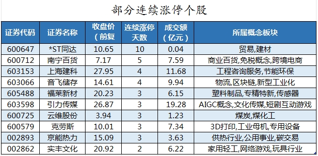 截至收盘,沪深两市合计1498只个股上涨,3394只个股下跌,平盘个股194只,停牌的个股2只。不含当日上市新股,共有48只个股涨停,14只个股跌停。连续涨停天数看,连续涨停天数超过2天的个股有16只。其中,*ST同达已连收10个涨停板,连续涨停板数量最多。