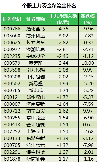 此外,3070只个股被主力资金净卖出,其中,27股被主力资金净卖出超1亿元。主力资金净流出最多的个股是通化金马,净流出金额为4.76亿元;主力资金净流出居前的个股还有苏州科达、长安汽车、浪潮信息、安妮股份、克劳斯,净流出金额分别为3.02亿元、2.82亿元、2.81亿元、2.46亿元、2.44亿元。