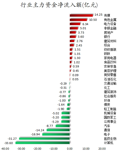 从行业板块来看,申万所属的31个一级行业,今日有16个行业板块主力资金呈现净流入,其中,传媒行业板块主力资金净流入最多,净流入金额14.25亿元;行业板块主力资金净流入居前的还有有色金属、电力设备、非银金融、房地产、银行,净流入金额分别为10.5亿元、6.34亿元、5.01亿元、3.73亿元、3.6亿元。15个行业板块主力资金呈现净流出,其中,计算机行业板块主力资金净流出最多,净流出金额为33.6亿元;行业板块主力资金净流出靠前的还有医药生物、电子、通信,净流出金额分别为31.27亿元、16.94亿元、14.24亿元。