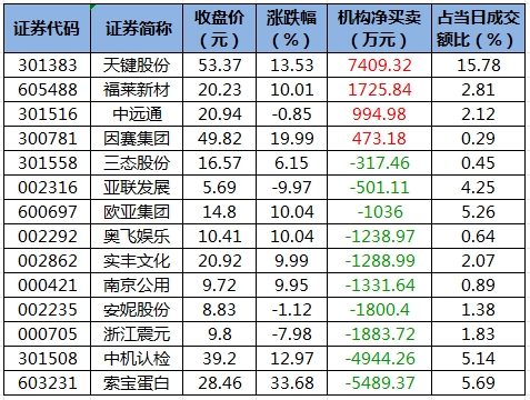 盘后龙虎榜数据显示,今日机构席位资金合计净卖出约9228.6万元。其中,净买入的个股4只,净卖出的个股10只。机构净买入最多的股票是天键股份,净买入金额约7409.32万元;机构净买入居前的还有福莱新材、中远通等股。机构净卖出最多的股票是索宝蛋白,净卖出金额约5489.37万元;机构净卖出居前的还有中机认检、浙江震元、安妮股份等股。