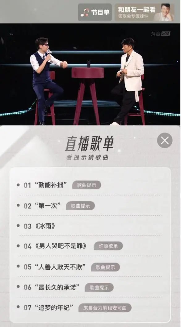 这场直播一共表演了7首经典曲目,包括《笨小孩》、《冰雨》、《男人哭吧不是罪》等。该场演唱会在抖音直播超过1.5小时,在线观看最终人次达到3.5亿。