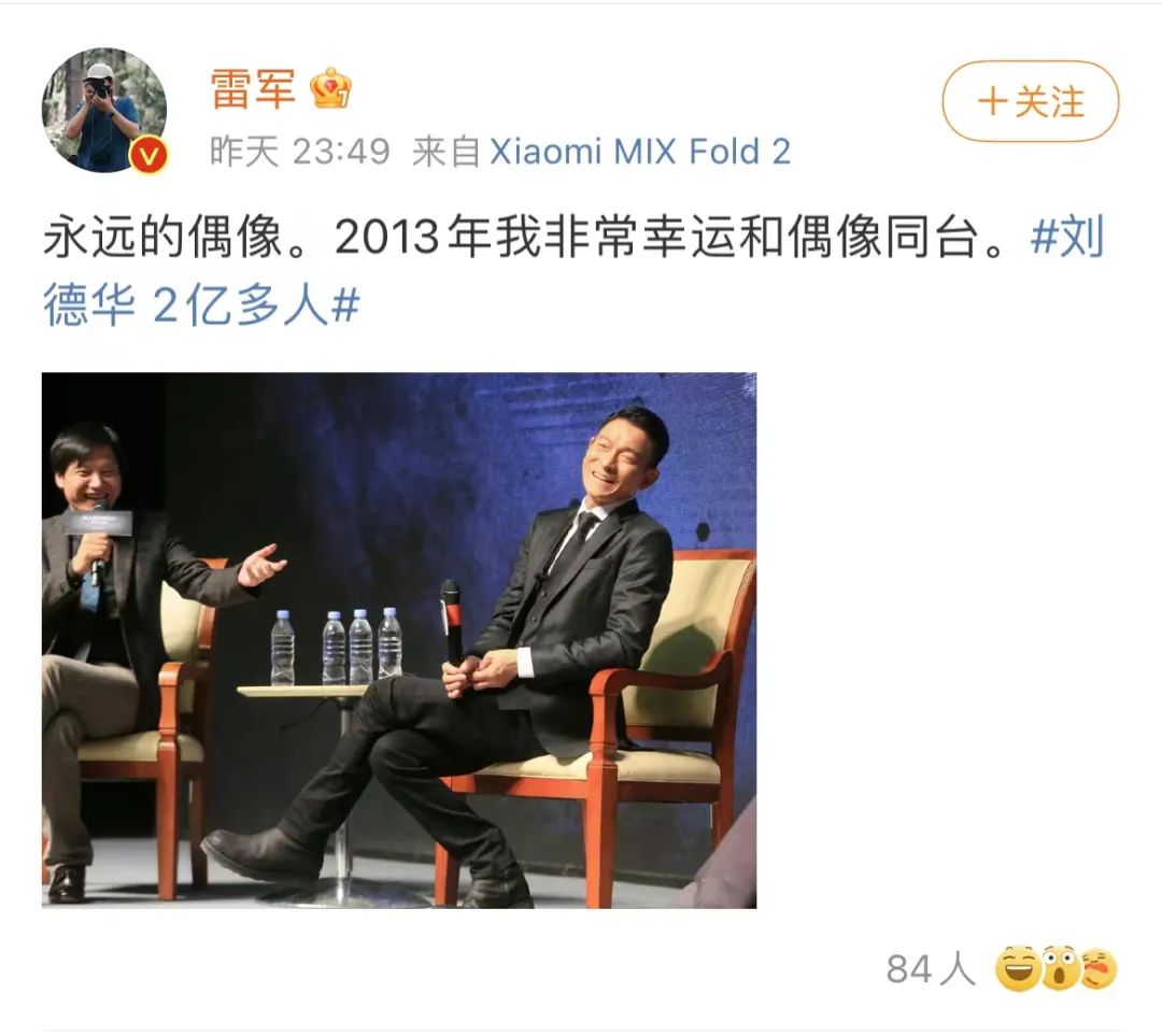 粉丝雷军也在微博直言:“永远的偶像。2013年我非常幸运和偶像同台。”