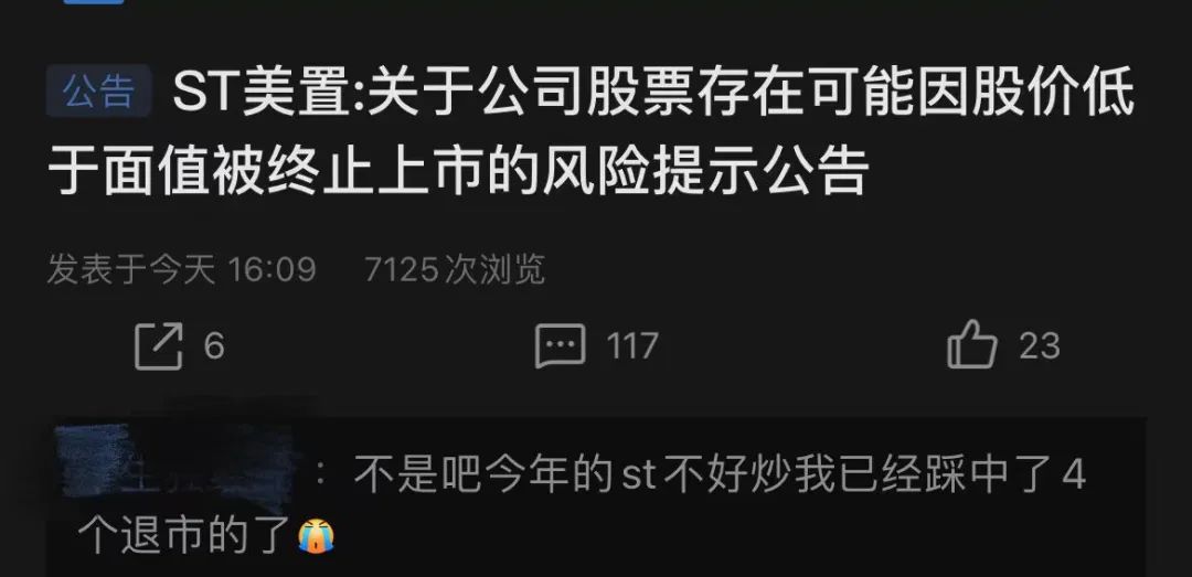 全面注册制加速A股上市公司优胜劣汰,近期面值退市股接二连三,ST板块也持续低迷,不少个股连续跌停。在股吧,有股民也感叹道:“今年的ST不好炒,已经踩中了4个退市的(公司)了”。