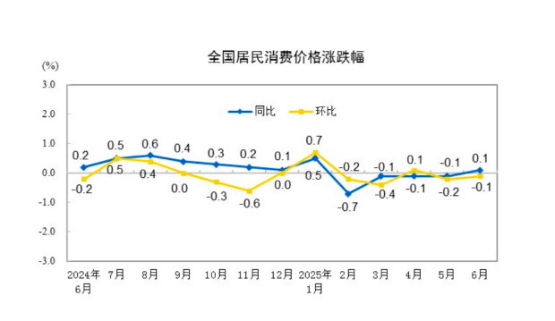 国家统计局7月9日发布的数据显示,6月居民消费价格指数(CPI)同比由上月下降转为上涨0.1%;环比下降0.1%。工业生产者出厂价格指数(PPI)环比下降0.4%,降幅与上月相同;同比下降3.6%,降幅比上月扩大0.3个百分点。