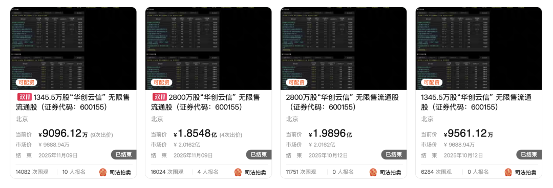 2025年11月9日,华创云信(600155)股东上海杉融实业有限公司持有的4145.5万股无限售流通股在淘宝网司法拍卖平台完成二次拍卖。