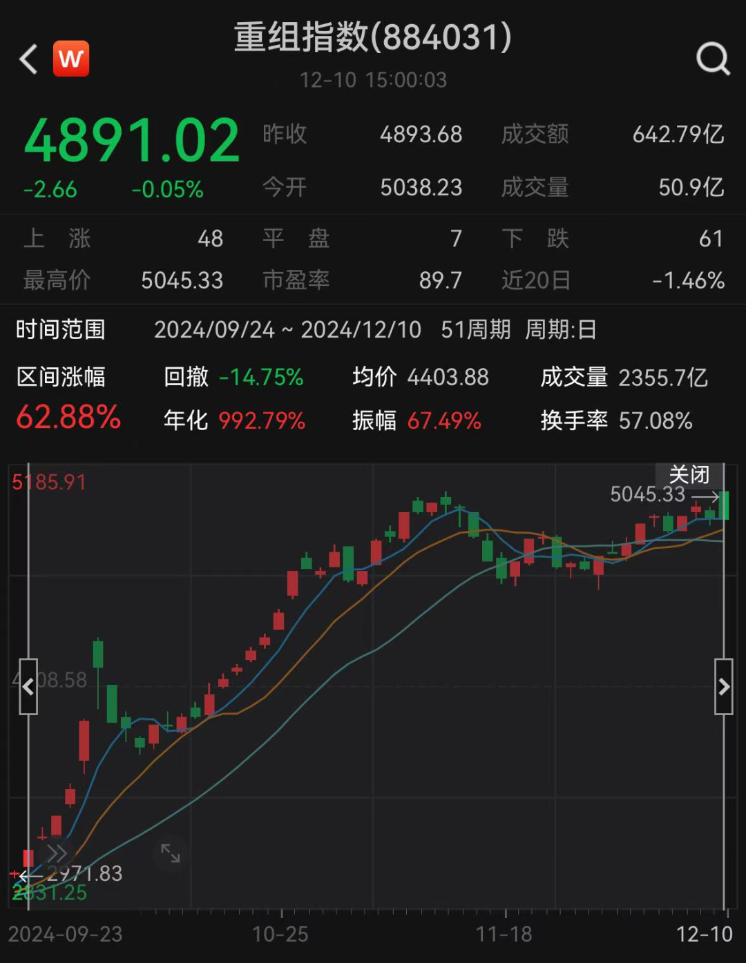 二级市场方面,并购重组概念股强势上涨,Wind重组指数自9月24日以来累计上涨近63%。