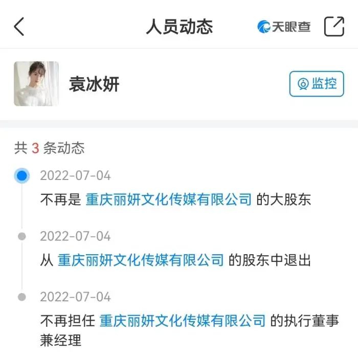 天眼查显示,2022年7月4日,袁冰妍退出重庆丽妍文化传媒有限公司执行董事兼经理职位,该公司已于2023年5月5日注销。