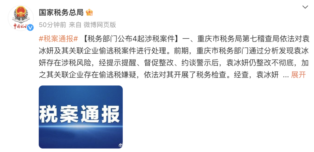 重庆市税务局第七稽查局依法对袁冰妍及其关联企业偷逃税案件进行处理。