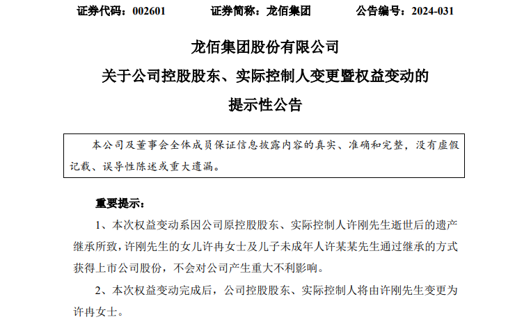 1个月前,龙佰集团董事会沉痛公告,公司控股股东、实际控制人、名誉董事长许刚于5月20日因病医治无效不幸离世,享年61岁。公司当时表示,许刚持有的公司股份将按法律、法规办理继承手续。
