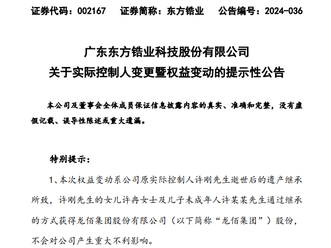 6月20日晚间,钛白粉巨头龙佰集团(002601)及其旗下东方锆业(002167)同步披露,公司实际控制人变更为许冉。许冉系一名“90后”,她也是龙佰集团创始人、原实际控制人许刚先生的女儿。