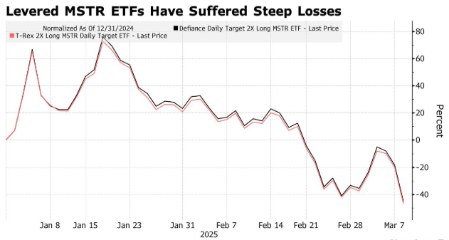交易所交易基金(ETF)便是最好的例子,它们寻求在各种虚拟货币或与加密货币相关的主题上提供丰厚的回报。周一跌幅最大的是两只为Strategy(MSTR.US)提供杠杆押注的ETF,这两只ETF当日跌幅均超过30%。Strategy是一家比特币控股公司,前身为MicroStrategy。