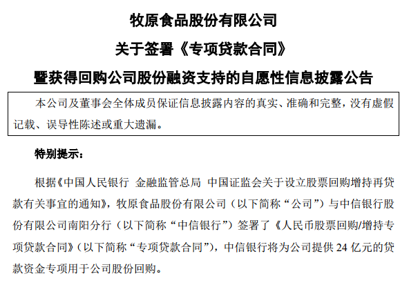 具体来看,根据披露信息,生猪养殖龙头牧原股份与中信银行南阳分行签署专项贷款合同,中信银行将为公司提供24亿元的贷款资金,专项用于股份回购。资料显示,今年9月,牧原股份曾发布回购计划,拟斥资30亿元至40亿元回购股份。截至10月18日,已回购金额为1亿元。