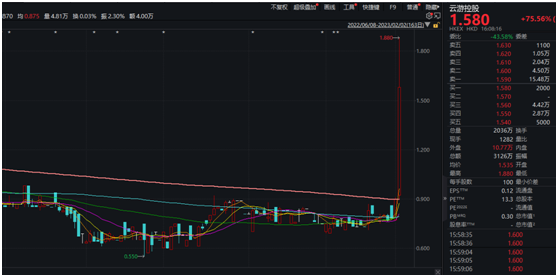 今天港股盘中再度出现翻倍个股。如云游控股盘中飙升,一度涨逾100%,后有所回落,截至收盘,仍大涨75.56%。