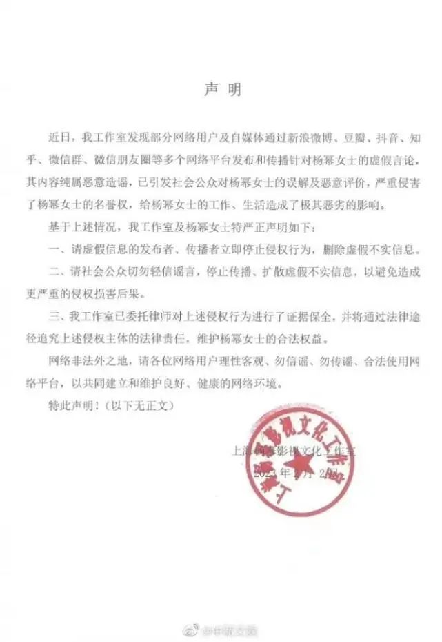 声明指出,近日,其工作室发现部分网络用户及自媒体通过新浪微博、豆瓣、抖音、知平、微信群、微信朋友圈等多个网络平台发布和传播针对杨幂女士的虚假言论。其内容纯属恶意造谣,已引发社会公众对杨幂女士的误解及恶意评价,严重侵害了杨幂女士的名誉权,给杨幂女士的工作、生活造成了极其恶劣的影响。