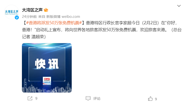 据大湾区之声消息,香港特区行政长官李家超今日(2月2日)在“你好,香港!”启动礼上宣布,将向世界各地旅客派发50万张免费机票,欢迎旅客来港。