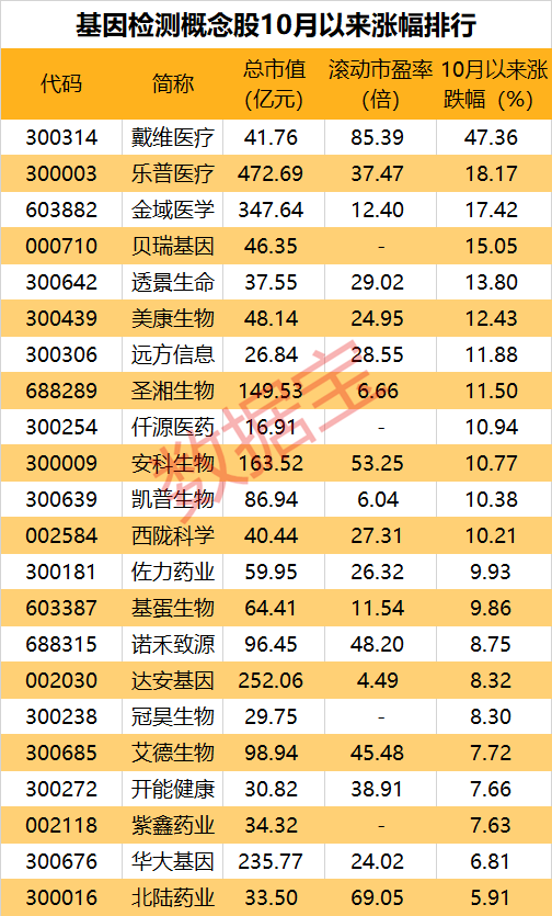 数据宝统计,10月以来,基因检测概念普遍表现较好,戴维医疗涨幅超47%,乐普医疗、金域医学、贝瑞基因涨超15%。