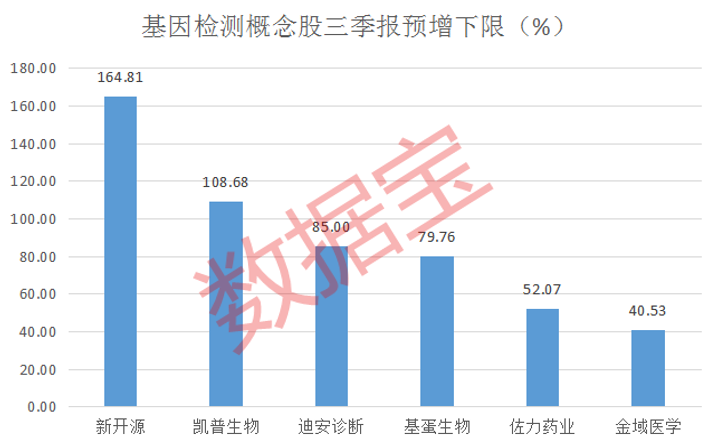 基因检测概念股中,已经有6股发布三季报业绩预告,均为预增。以净利润同比增幅下限看,新开源、凯普生物三季报净利润翻倍,迪安诊断、基蛋生物、佐力药业增幅超过50%。