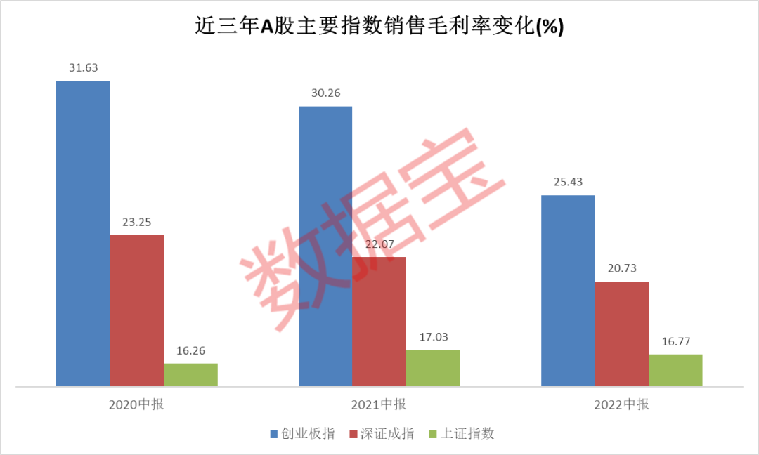 销售毛利率是反映上市公司盈利能力及竞争力的重要指标之一。数据宝统计,受疫情反复以及上游原材料、能源价格上涨等因素影响,2020年以来,A股整体毛利率延续低位反映成本承压;深证成指、创业板指毛利率均在2022年上半年创下近五年同期低点,上证指数毛利率近三年也处于低位。