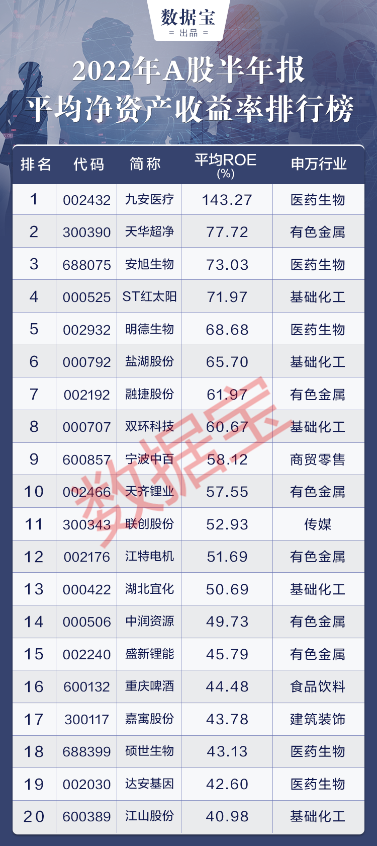 数据宝发布《2022年A股半年报平均净资产收益率排行榜》,本排行榜剔除了注册制上市中尚未实现盈利的公司简称带U的股票。