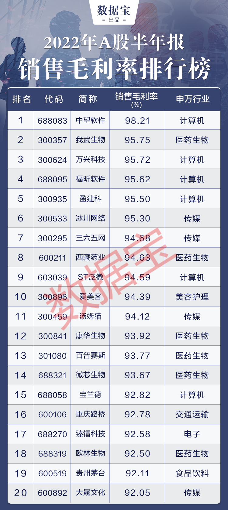 数据宝发布《2022年A股半年报销售毛利率排行榜》,排行榜前50的上市公司主要集中于医药生物、计算机以及传媒行业,分别有26股、10股和6股。传媒板块上榜个股有冰川网络、汤姆猫、吉比特、巨人网络等,普遍具有游戏或元宇宙概念。
