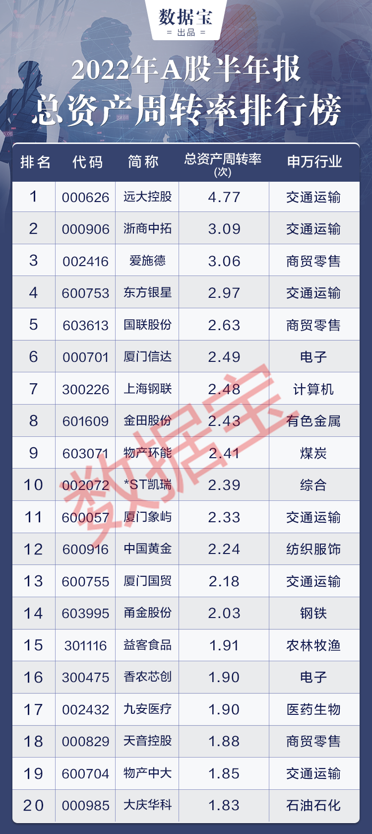 数据宝发布《2022年A股半年报总资产周转率排行榜》,总资产周转率前50名集中在交通运输、有色金属、商贸零售、石油石化等行业。