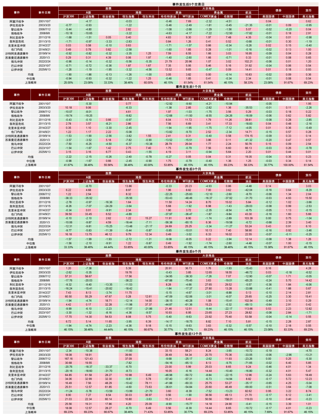 注:数据为近四次中东地缘军事冲突(2019年沙特阿美遇袭、2020年苏莱曼尼遇袭、2023年巴以冲突、2025年以伊冲突)发生后,各行业涨幅中位数