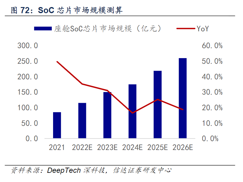 随着汽车电子电气架构向域集中式转变,SoC芯片需求快速增加,预计2021-2026年CAGR将达25%。信达证券陆嘉敏认为,假设我国汽车产量2022年增速7%,2023-2026年增速3%-5%之间,预计2026年我国SoC芯片渗透率有望达到66%,市场规模将在260亿元左右。
