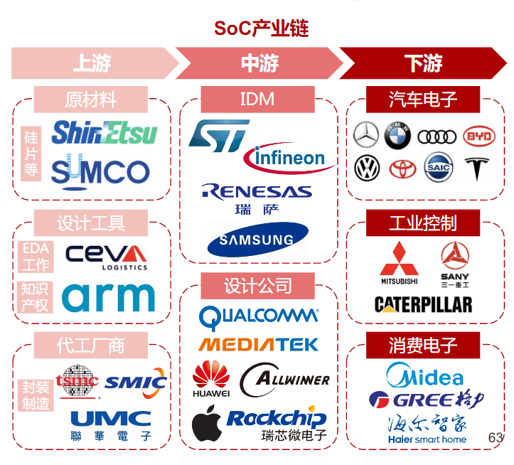 SoC芯片产业链主要分为上游硅片原材料、设计工具EDA工作和知识产权、封装制造代厂商;中游IDM和设计公司;下游汽车电子、工业控制、消费电子。
