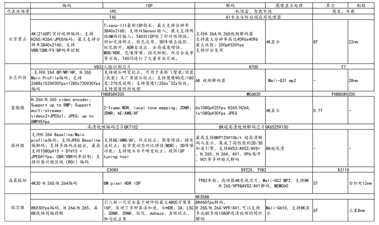 北京君正的核心技术主要有CPU技术、低功耗技术以及SOC芯片的研发技术等;富瀚微致力于为客户提供高性能视频编解码SoC芯片、图像信号处理器ISP芯片及前后端一站式完整的产品解决方案。国科微已开发推出的NVRSoC芯片,顺应智能化和超高清发展趋势,支持后端多种智能算法应用。晶晨股份主营业务为多媒体智能终端SoC芯片的研发、设计与销售。