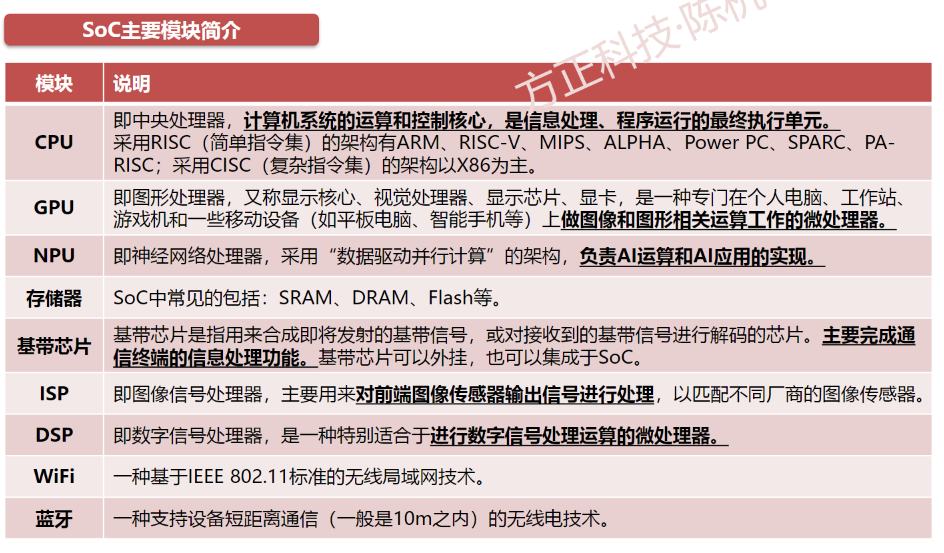 SoC即片上系统,是智能设备的大脑,是将系统关键部件集成在一块芯片上,可以实现完整系统功能的芯片电路。通常情况下,SoC拥有整个数字和模拟电路系统的完整功能。SoC芯片作为系统级芯片,集成有CPU、GPU、NPU、存储器等模块。财通证券张益敏认为,SOC芯片为数字芯片皇冠。