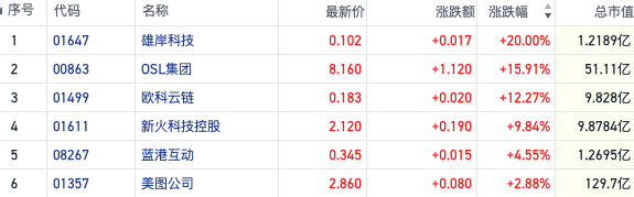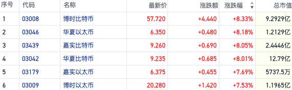 截至发稿,个股方面,雄岸科技(01647.HK)涨超20%,OSL集团(00863.HK)涨约16%,欧科云链(01499.HK)涨超12%,新火科技控股(01611.HK)、美图公司(01357.HK)跟涨。此外,在港交所上市的多只数字货币ETF今日也全线上扬。