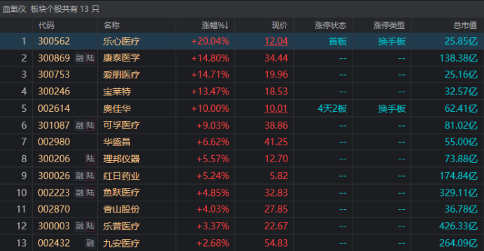 今日(12月28日)早盘,血氧仪概念股集体拉升,截止午间收盘,乐心医疗、奥佳华双双涨停,康泰医学、爱朋医疗、宝莱特涨幅超10%,可孚医疗、华盛昌、理邦仪器、红日药业等股也涨幅居前。