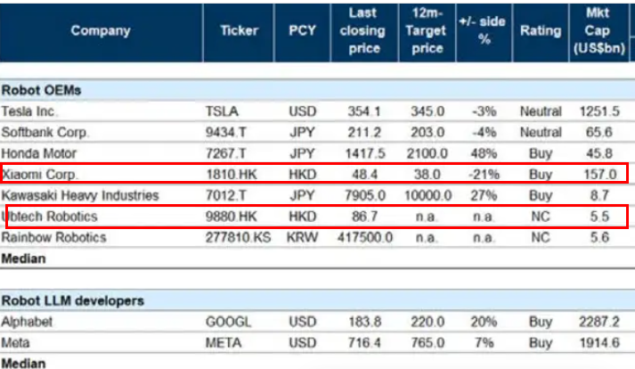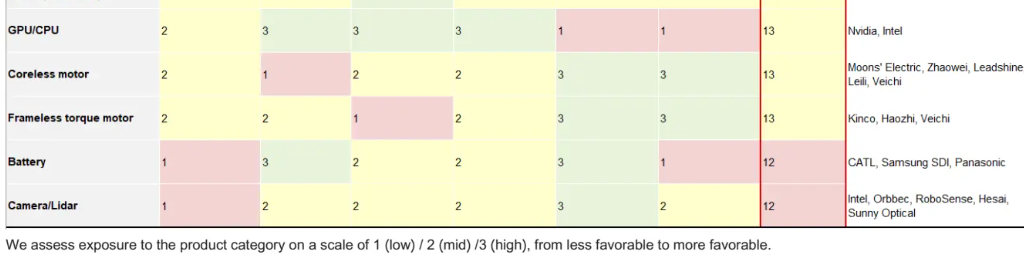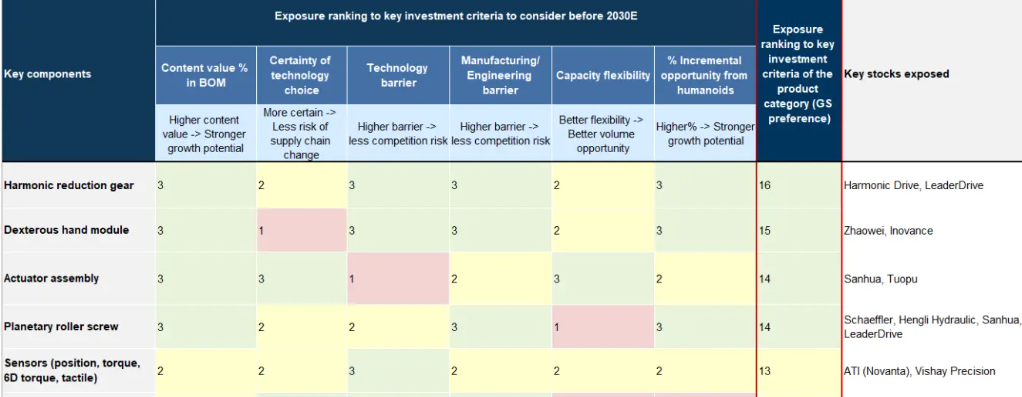 我们认为,现阶段最佳的投资机会仍在于供应链零部件股票,因为主要的机器人企业要么是非上市公司(韩国的彩虹机器人和中国的优必选除外),要么是大型企业旗下的研发项目(如特斯拉、英伟达、苹果、比亚迪、小米、小鹏等),机器人基础模型相关企业(如 OpenAI、谷歌、Meta、英伟达等)也是如此。话虽如此,我们也注意到竞争风险(人形机器人的潜力目前已受到广泛关注),以及在发展早期阶段零部件技术的不确定性(硬件配置仍在不断演变)。在本报告中,我们引入了高盛专有的产品类别偏好排名,以评估我们覆盖范围内的关键投资机会 —— 我们更看好执行器组装商和谐波减速机供应商,因为它们在产品应用方面确定性更高,且技术壁垒更强;推荐买入恒立液压(HDS)、三花智控(Sanhua)、拓普集团(Tuopu)。