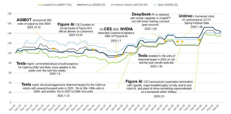 图表:中国的人形机器人零部件相关股票的股价表现(指数化)、关键事件及指引更新