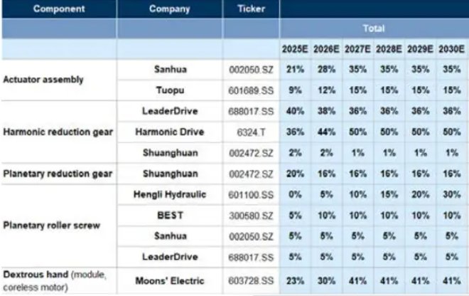 图表:高盛所覆盖的人形机器人供应链公司的市场份额预期