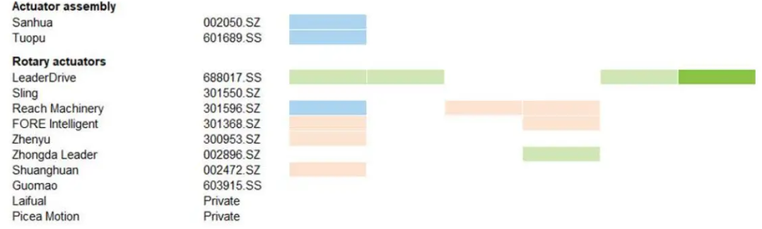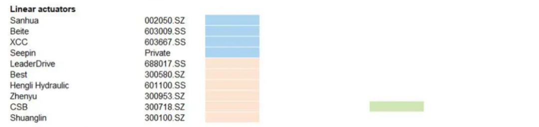 高端产品:鉴于舍弗勒(Schaeffler)在产品开发方面有更长的历史,且三花智控也指出舍弗勒是其目前的主要供应商,我们假设舍弗勒在行星滚柱丝杠领域占有 50%-60% 的市场份额。然而,如果人形机器人功能改进的速度超出我们的预期,这可能会吸引更多行业外的企业进入该领域。虽然思进智能(非上市公司)、浙江新柴股份(603667.SS,未覆盖)、贝斯特(603009.SS,未覆盖)都分享了他们在相关开发上取得较快进展的观点,但我们认为从长远来看,像恒立液压这样研发能力和制造技术更强的企业可能占据更高的市场份额。三花智控和贝斯特也在购买顶级的研磨设备,以开发行星滚柱丝杠的制造能力。批量生产要求非常注重成品率、生产一致性和产能提升能力,这与目前的送样阶段不同。因此,我们认为该领域的长期市场份额归属仍不明朗。