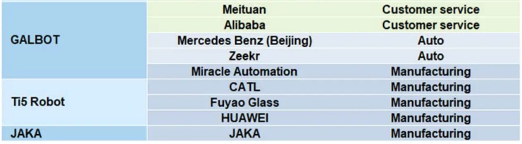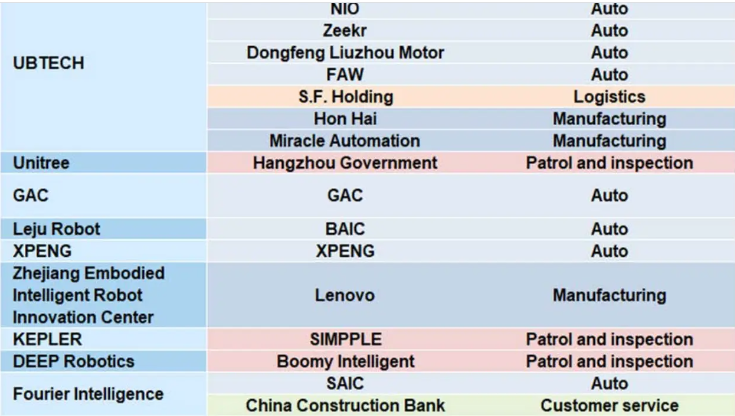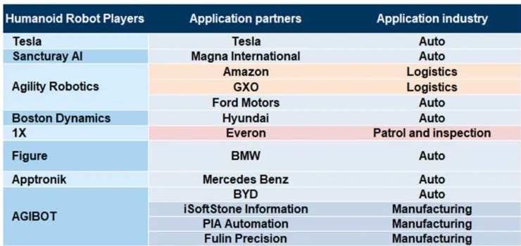 大多数已公布的与人形机器人企业合作的应用伙伴集中在汽车和制造业。
