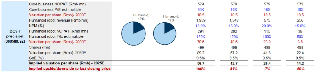 估值上行潜力将来自核心业务加上人形机器人业务的估值,后者源自对全球人形机器人出货量、每台机器人的零部件价值、公司所涉市场份额的推断,再结合经标准化净营业利润(NPM)得出的市盈率倍数。估值下行风险仅来自核心业务,此时人形机器人业务的估值期权性为零。