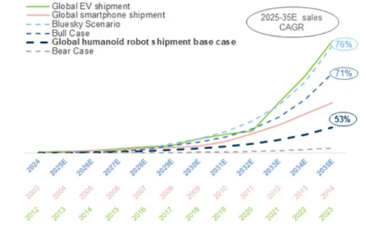 高盛对全球人形机器人出货量的预测(2024 年 - 2035 年),与全球电动汽车出货量(2012 - 2023 年)和全球智能手机出货量(2003 - 2014 年)对比